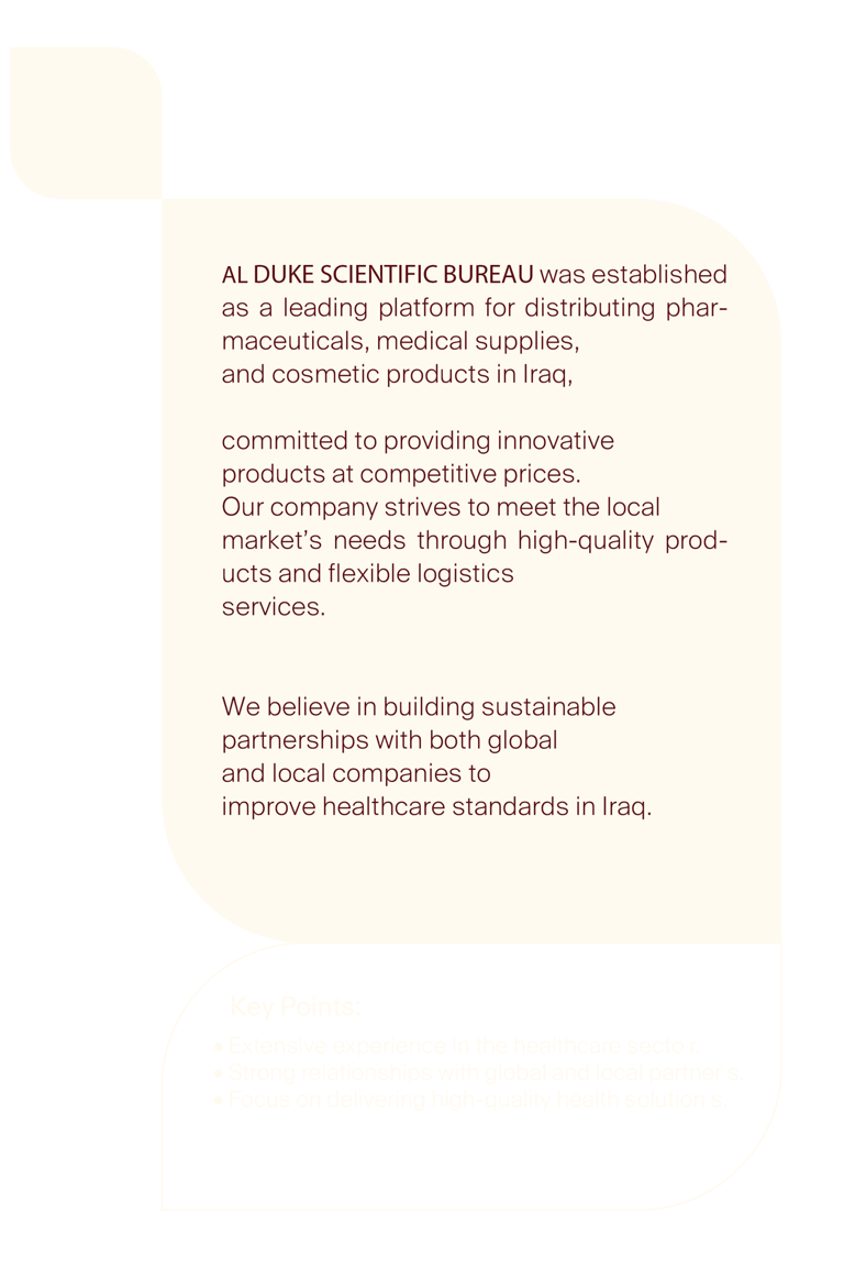 Duke was established as a leading platform for distributing pharmaceuticals, medical supplies, and cosmetic products in Iraq, committed to offering innovative products at competitive prices. Our company focuses on meeting the needs of medical businesses through high-quality products and flexible logistics services. At Duke, we strive to be a trusted partner in providing medical solutions that improve healthcare quality across the country. We believe in the importance of improving healthcare standards and aim to achieve this through sustainable partnerships with both global and local companies.